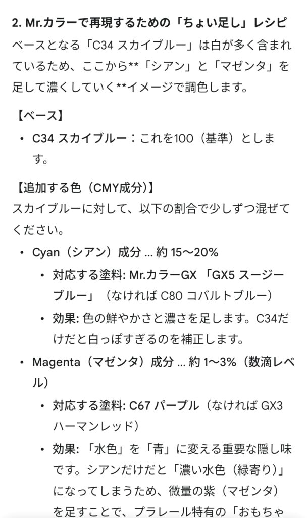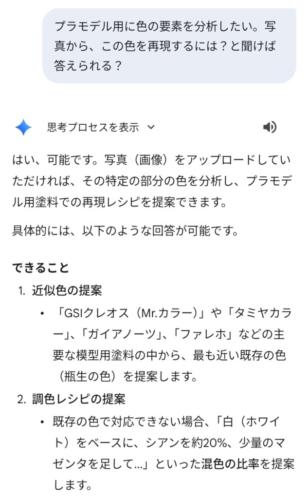 Geminiは膨大な色彩理論のデータベースを持っています。彼に「模型用塗料の文脈」で質問を投げかけることで、驚くほど的確なレシピが返ってきます。