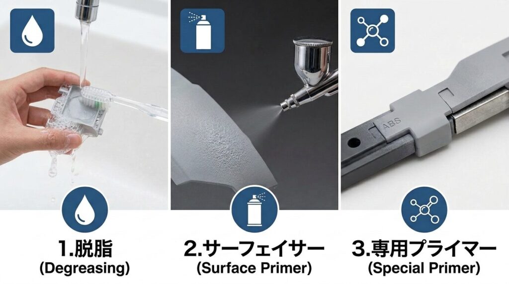 関節部によく使われるABS樹脂や、ディティールアップ用のエッチングパーツ(金属)などは、一般的なスチロール樹脂(PS)に比べて表面が滑らかで塗料が定着しにくいという性質を持ちます。これらに直接塗料を乗せるのは、氷の上にペンキを塗るようなものです。