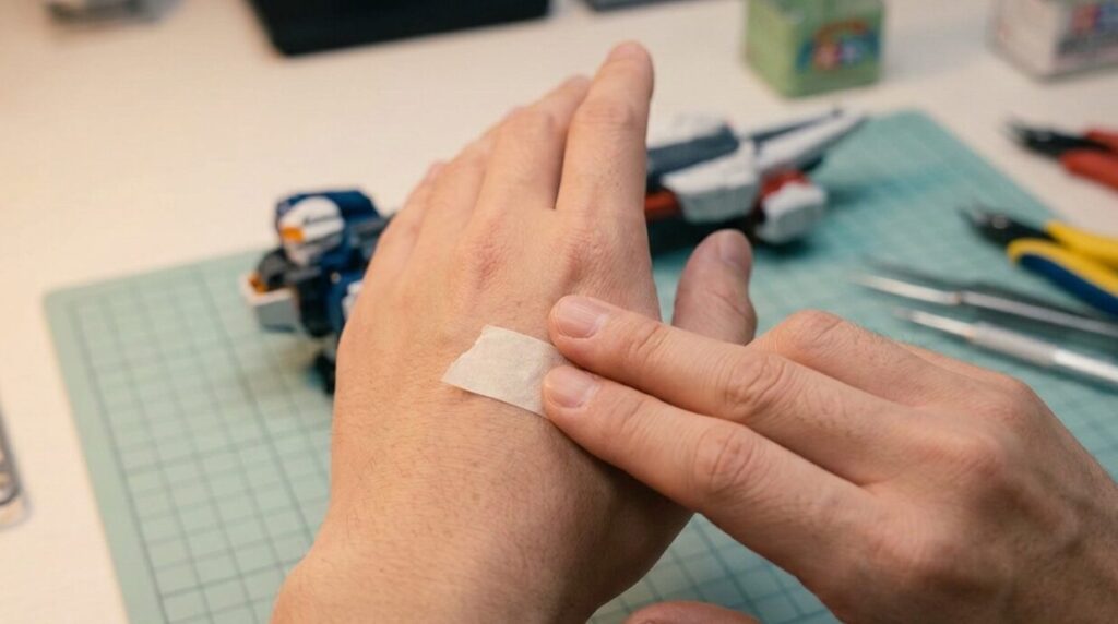 切り出したマスキングテープを、自分の手のひらや手の甲などに2〜3回ペタペタと貼って剥がし、適度に粘着力を弱めましょう。人間の肌の微量な油分と水分が、テープの過剰な接着力をマイルドにしてくれます。これにより、塗料の境界線を守りつつ、剥がす際の塗膜へのダメージを最小限に抑えることができます。